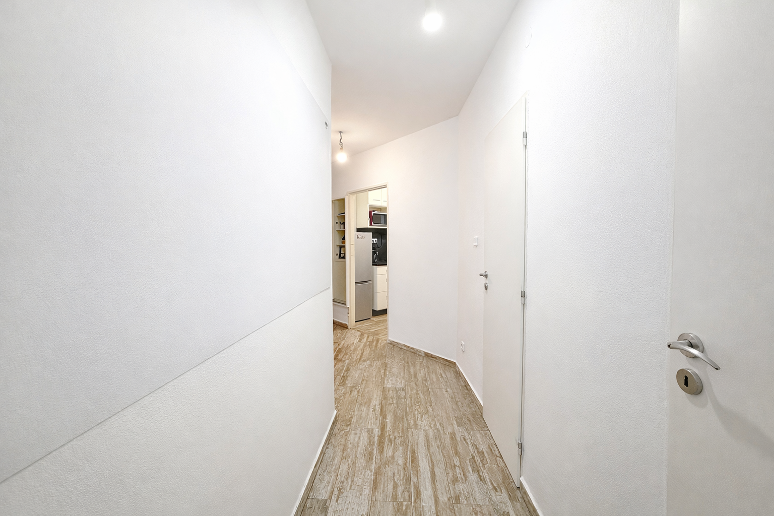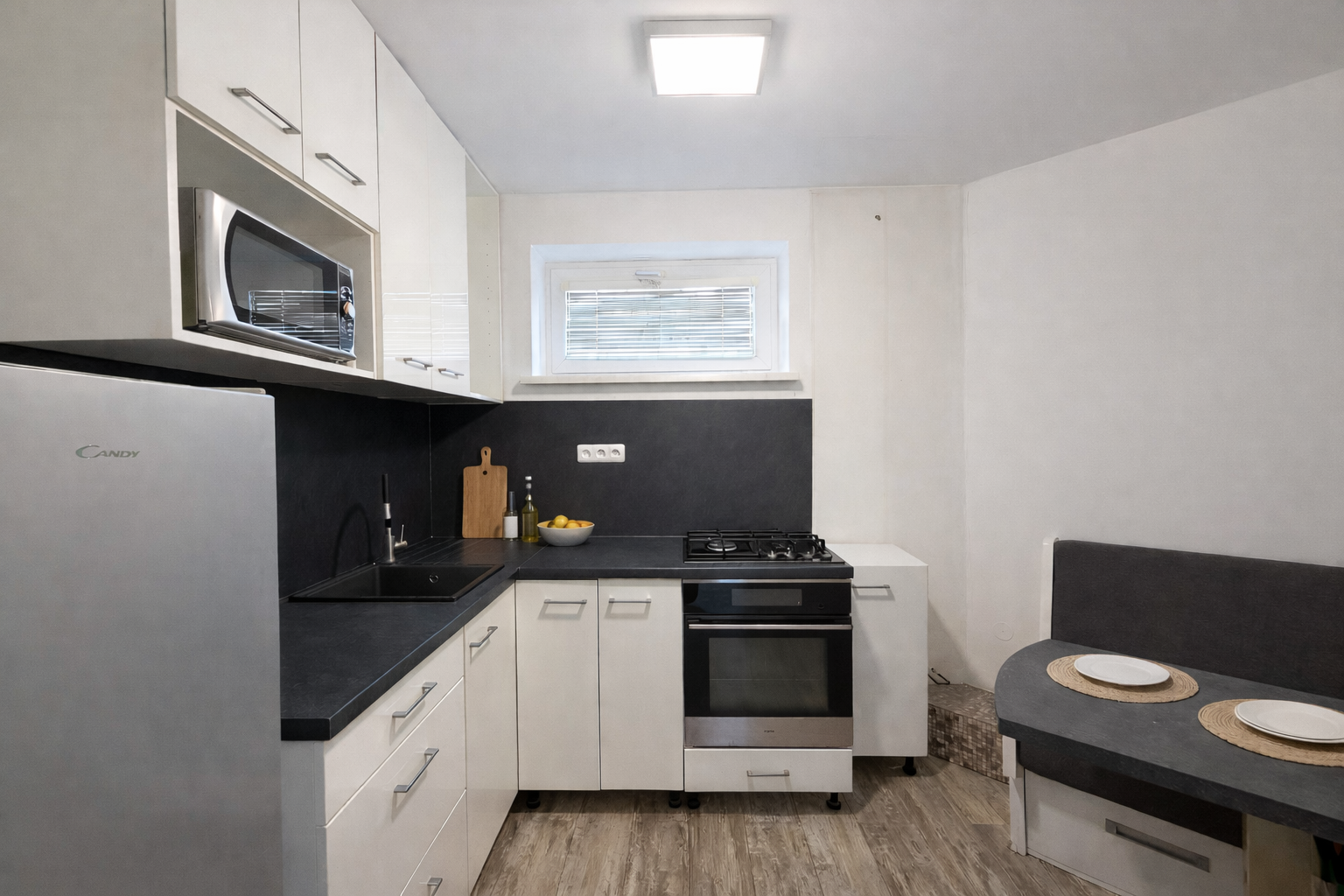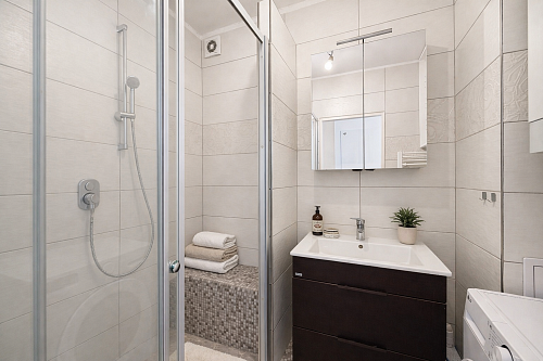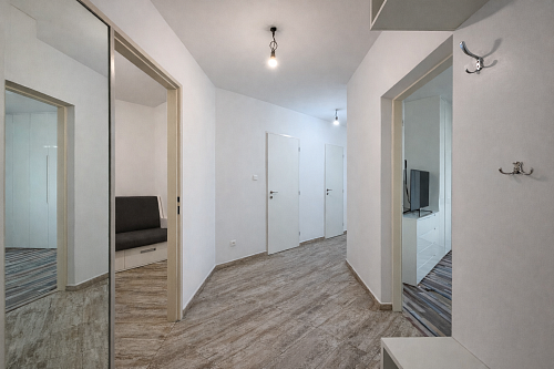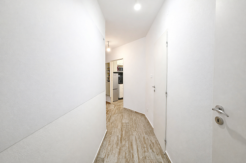 Dispozice zahrnuje prostorný obývací pokoj, samostatný dětský pokoj a kuchyň s moderní linkou včetně spotřebičů a jídelního kouta. Koupelna se sprchovým koutem, WC samostatné.